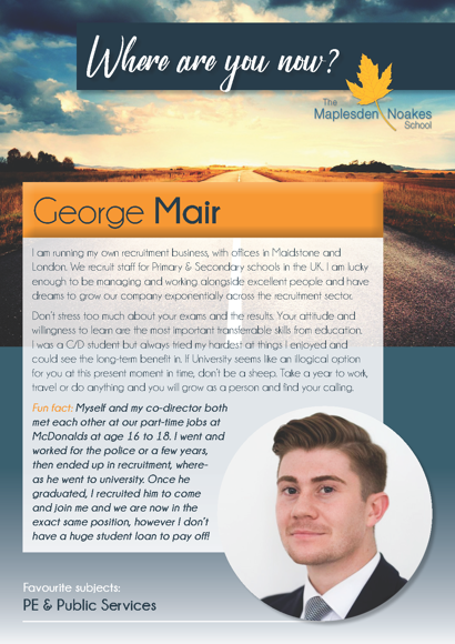 We have an active Linked In group, please request to join The Maplesden Noakes Alumni Group page if you are a member on Linked In.